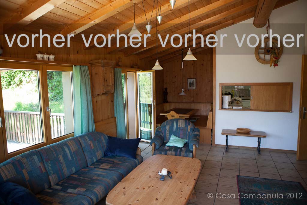 Der Umbau vom „Casa Campanula“ konzentrierte sich darauf, zwei Wohnungen zu einer Grossen zusammen zu legen und ein harmonisches und offenes Raumgefühl zu schaffen. Die fünf Schlafzimmer sollten mit minimalem Aufwand aufgewertet und modernisiert werden. Zusammen mit den Architekten haben wir den neuen Grundriss definiert, in dem das Wohnzimmer mit Essbereich und die Küche zu einem grosszügigen Aufenthaltsraum zusammengelegt wurden.